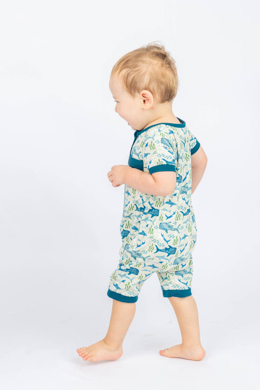 Shark Friends Bamboo Baby Shortie Romper Jumpsuit: Blue/Multi / 0-3M