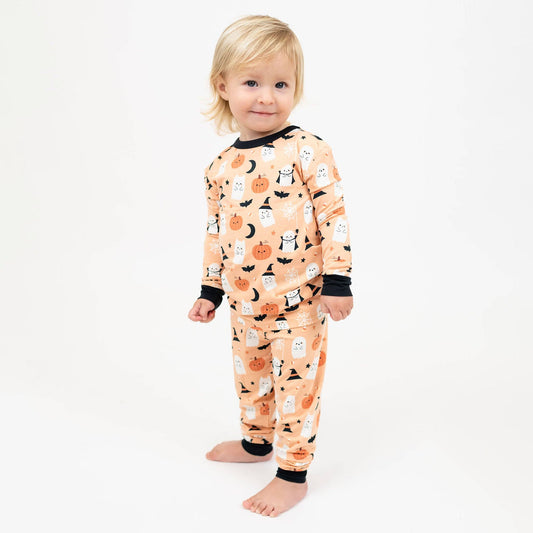 Boo-Tastic Glow-in-the-Dark Halloween Two-Piece Bamboo Long Sleeve Kids Pajama Pants Set: Orange/Multi / 2T