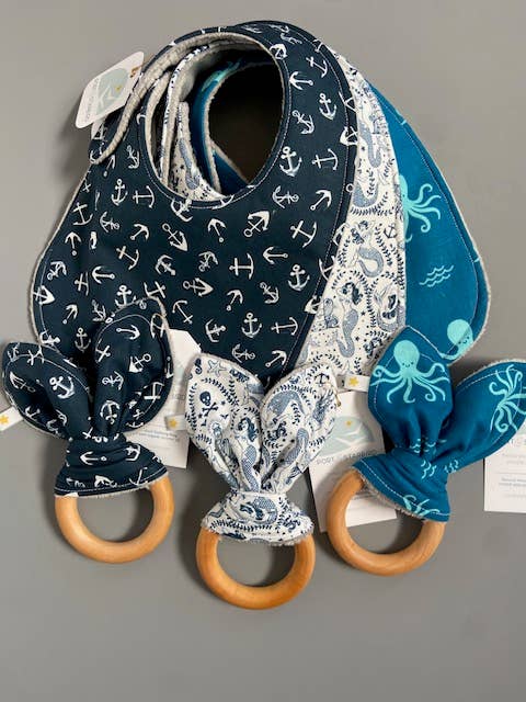 This toy does double duty! Each bunny ear looped fabric is backed with super soft snuggle fabric and has baby *crinkle paper sewn in for added sensory play. (Every wooden ring is rubbed in a small amount of organic coconut oil)