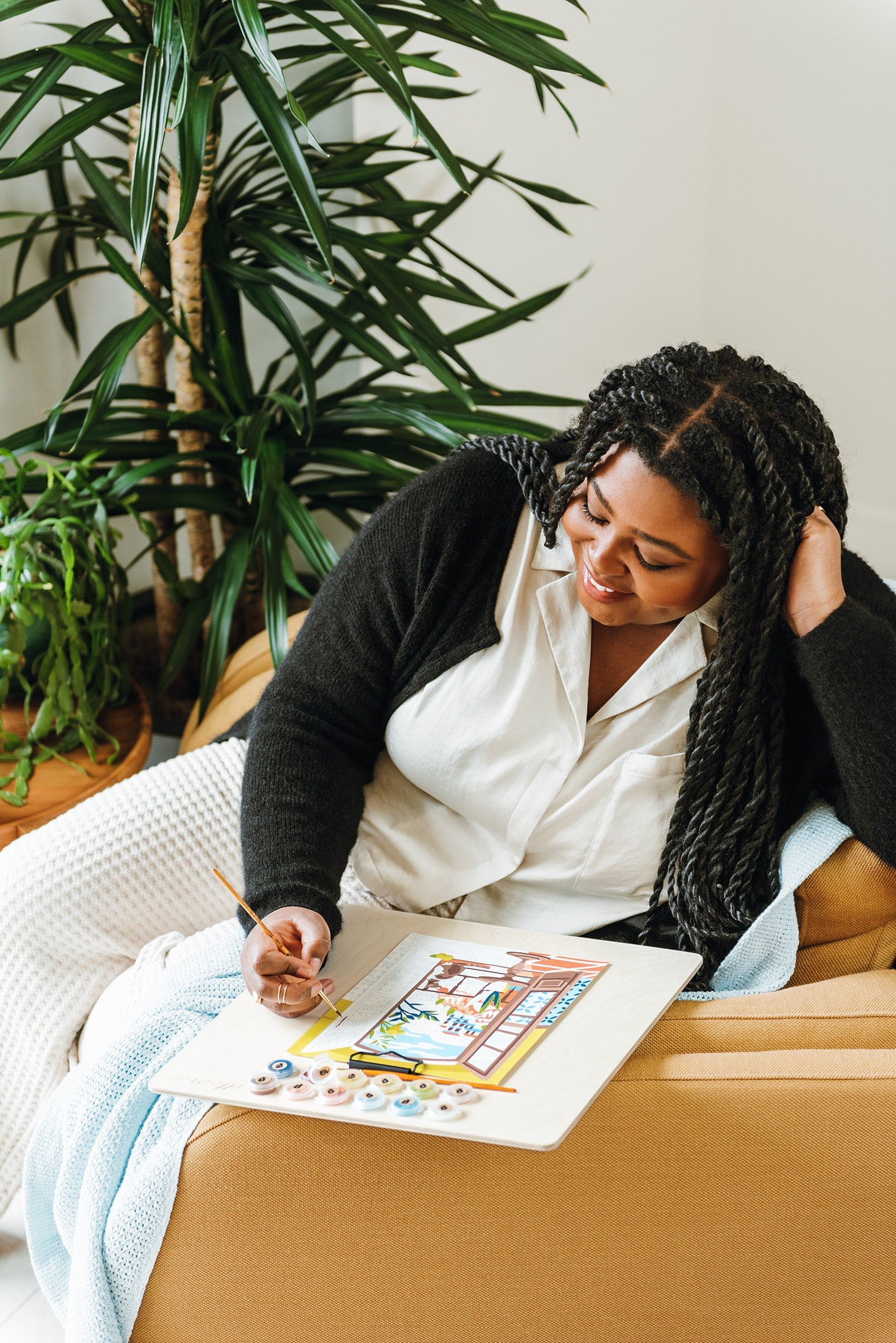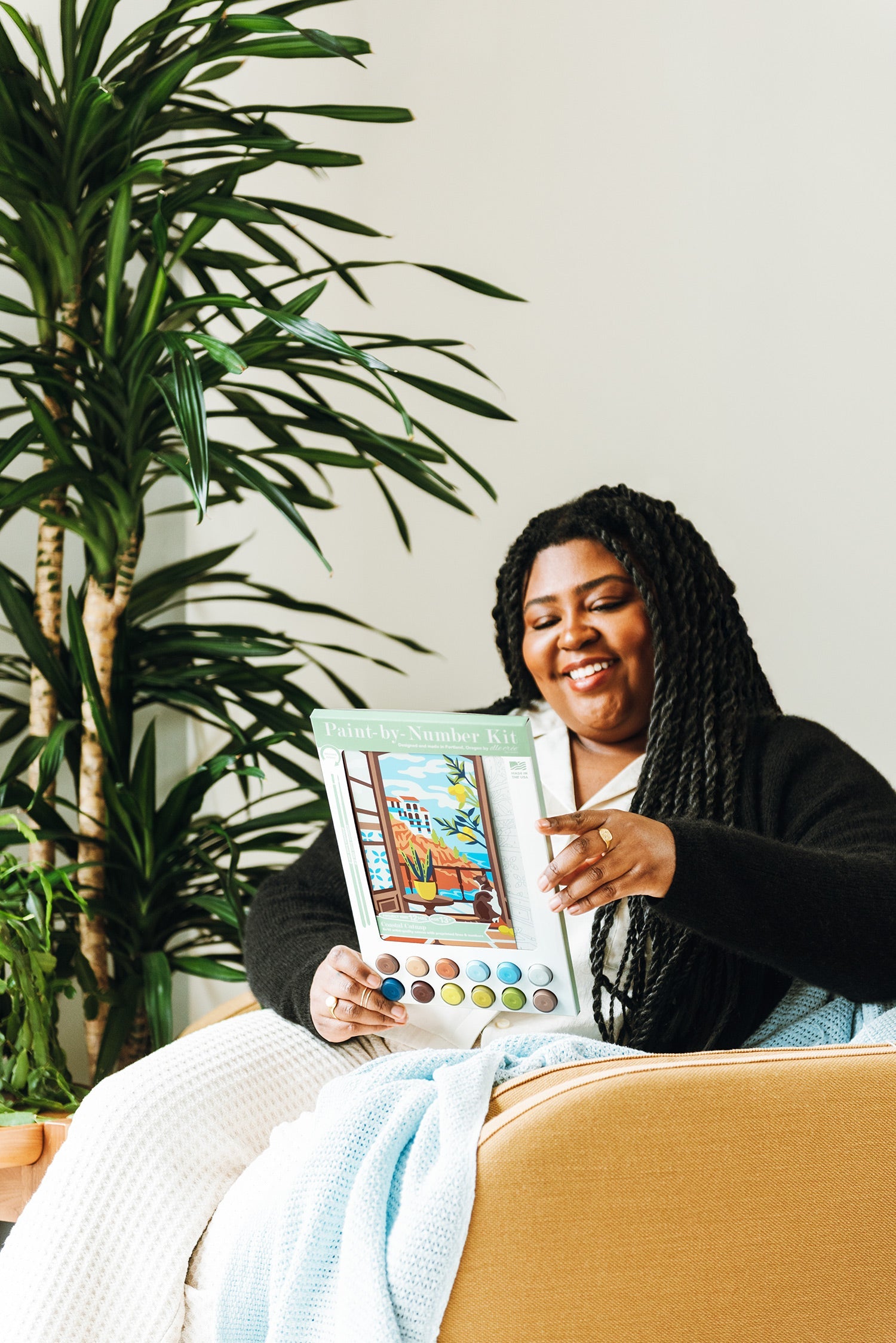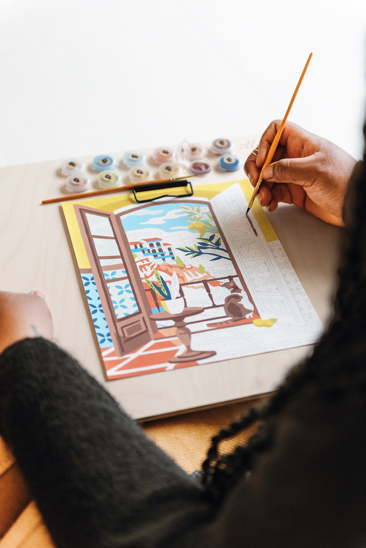 The Coastal Catnap paint-by-number kit features a dreamy terrace view of the Mediterranean’s lapping waves and an airy villa perched on the hillside overlooking the sea while a calico cat peers from the door frame and lemon tree branches peek from the balcony. Completing the acrylic painting can take 12-14 hours. When completed, select a frame at your local craft store and display your new handmade home decor! This DIY craft is recommended for adults and teens age 13 and up.
