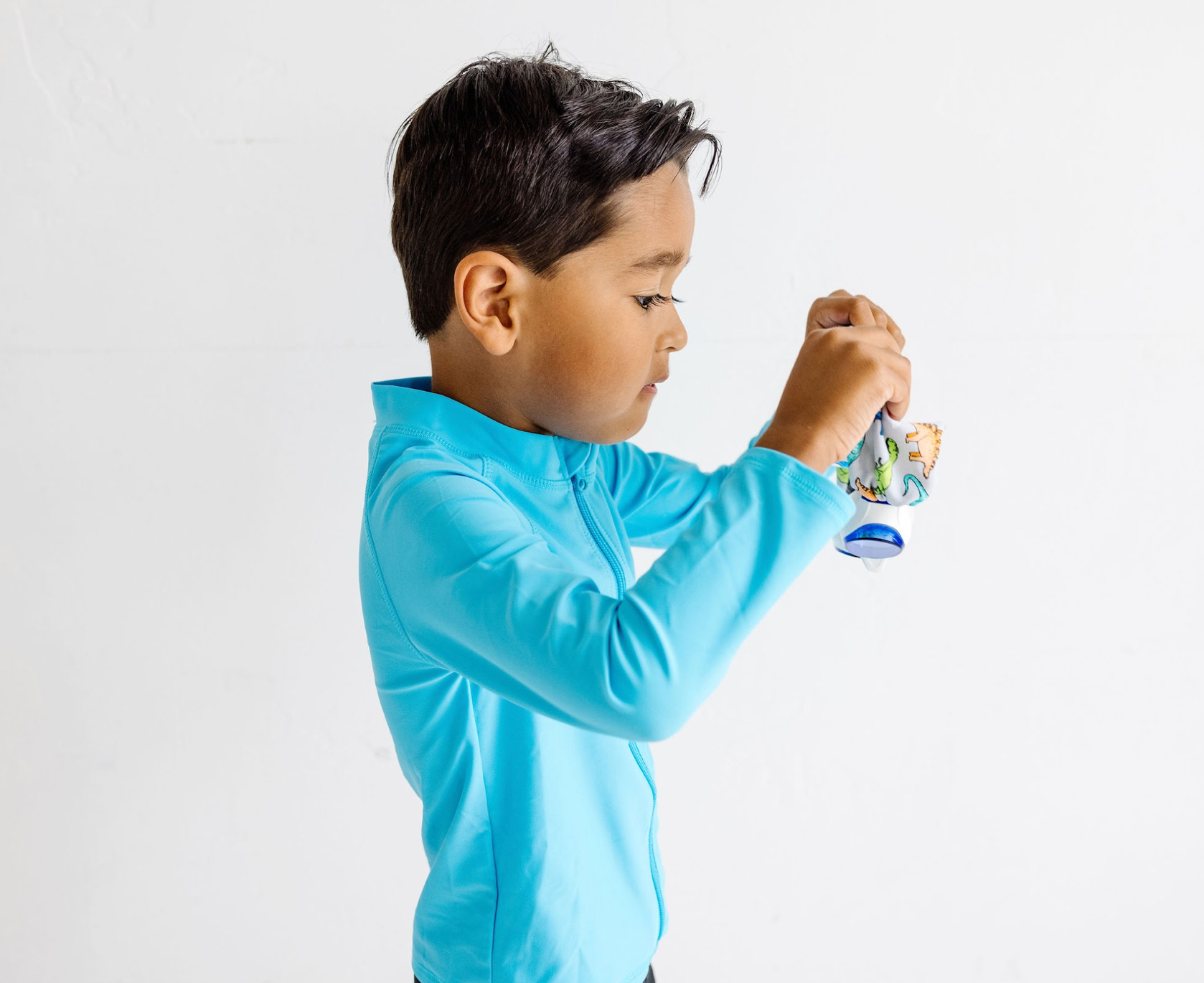 Our dino swim goggle features our tangle-free strap in a colorful dinosaur print with a light grey background, paired with a white frame and lightly tinted gray lenses.