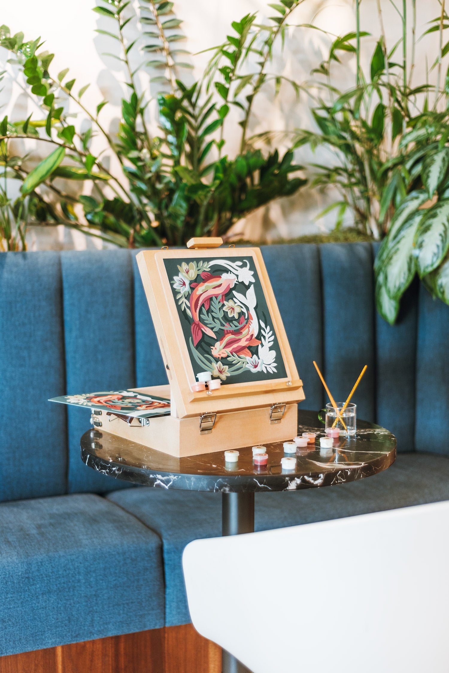 Koi Fish in Pond paint-by-number kit features two stylized carp in a pool of water swirling with lily flowers and vines. The pre-printed background features a deep green pool. Completing the acrylic painting can take 8+ hours. When completed, select a frame at your local craft store and display your new handmade home decor! This DIY craft is recommended for adults and teens age 13 and up.