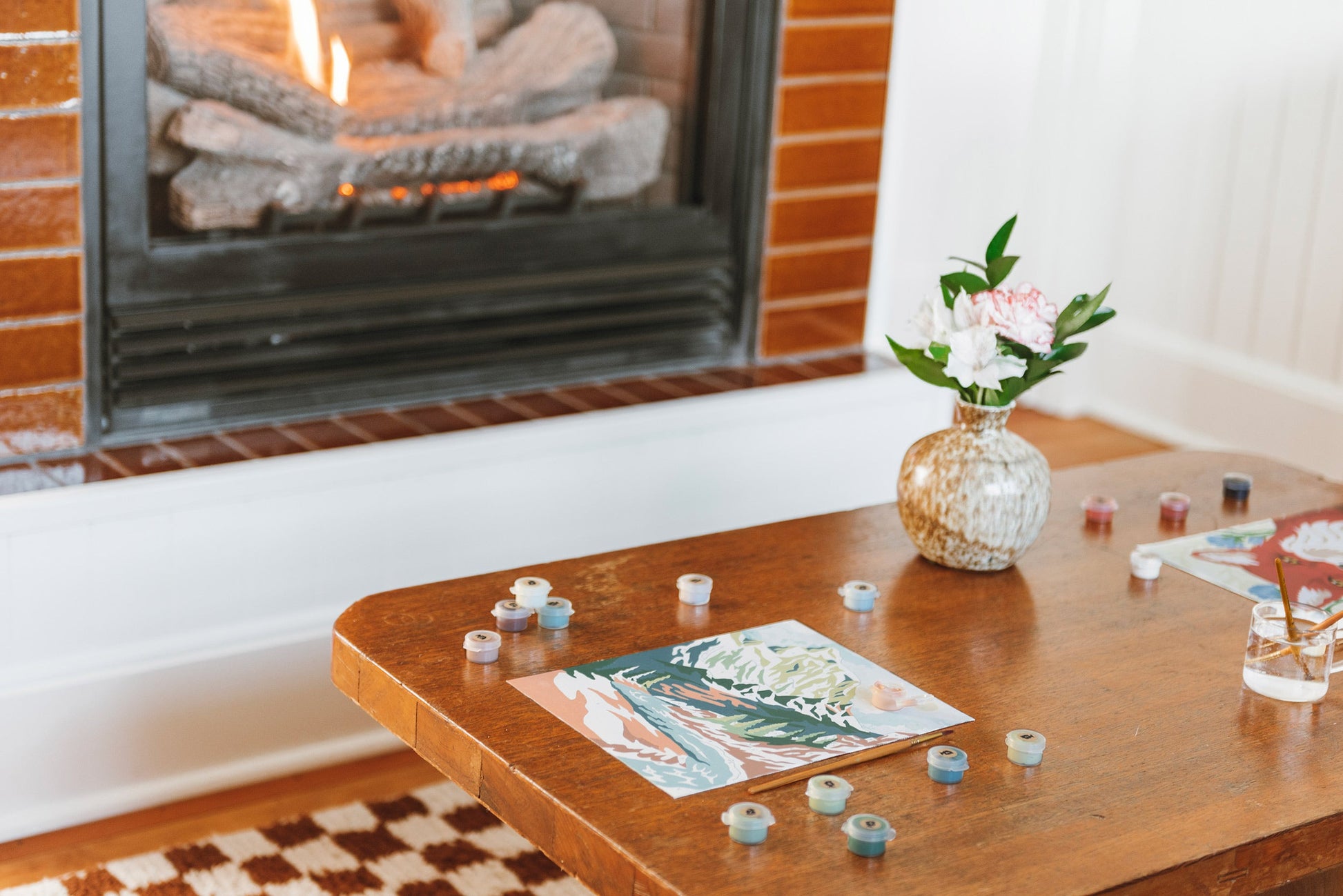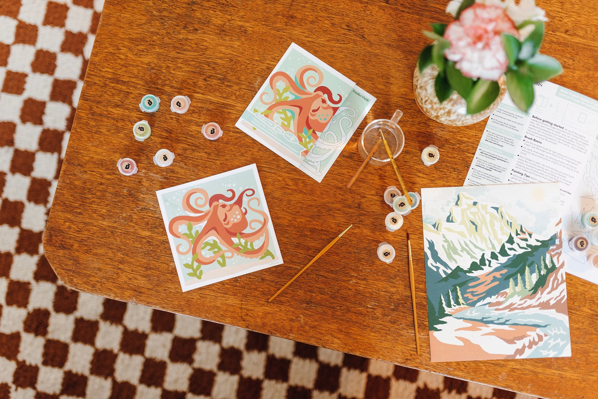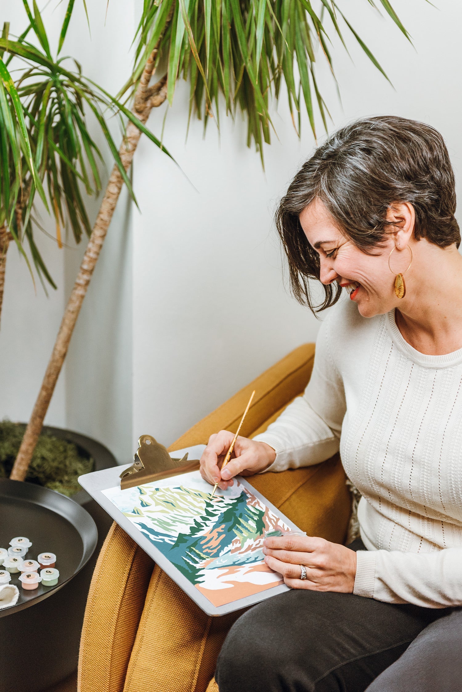 Mountainscape paint-by-number kit depicts a multicolored snowy mountain landscape with a winding river and pine trees. The pre-printed background features a faint blue cloudy sky with a small sun. Completing the 12-color acrylic painting can take between 6-8 hours. When completed, select a frame at your local craft or thrift store and display your new handmade home decor! This paint-by-number kit is recommended for adults and teens age 13 and up.