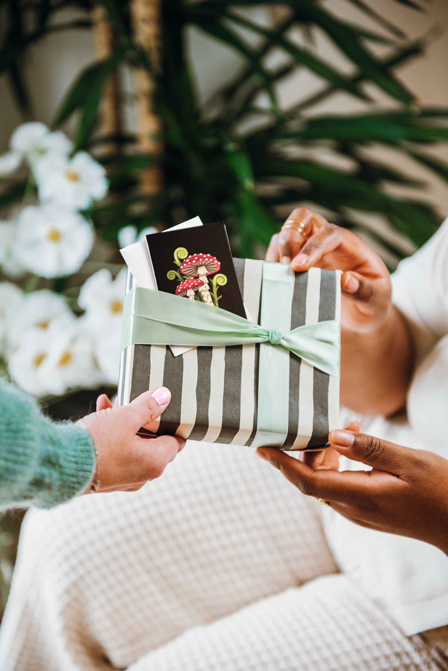 Cards printed on stock with 10% post-consumer waste content. Envelopes printed on stock with 30% post-consumer waste content. Packaging printed on FSC® CoC certified 100% recycled stock.