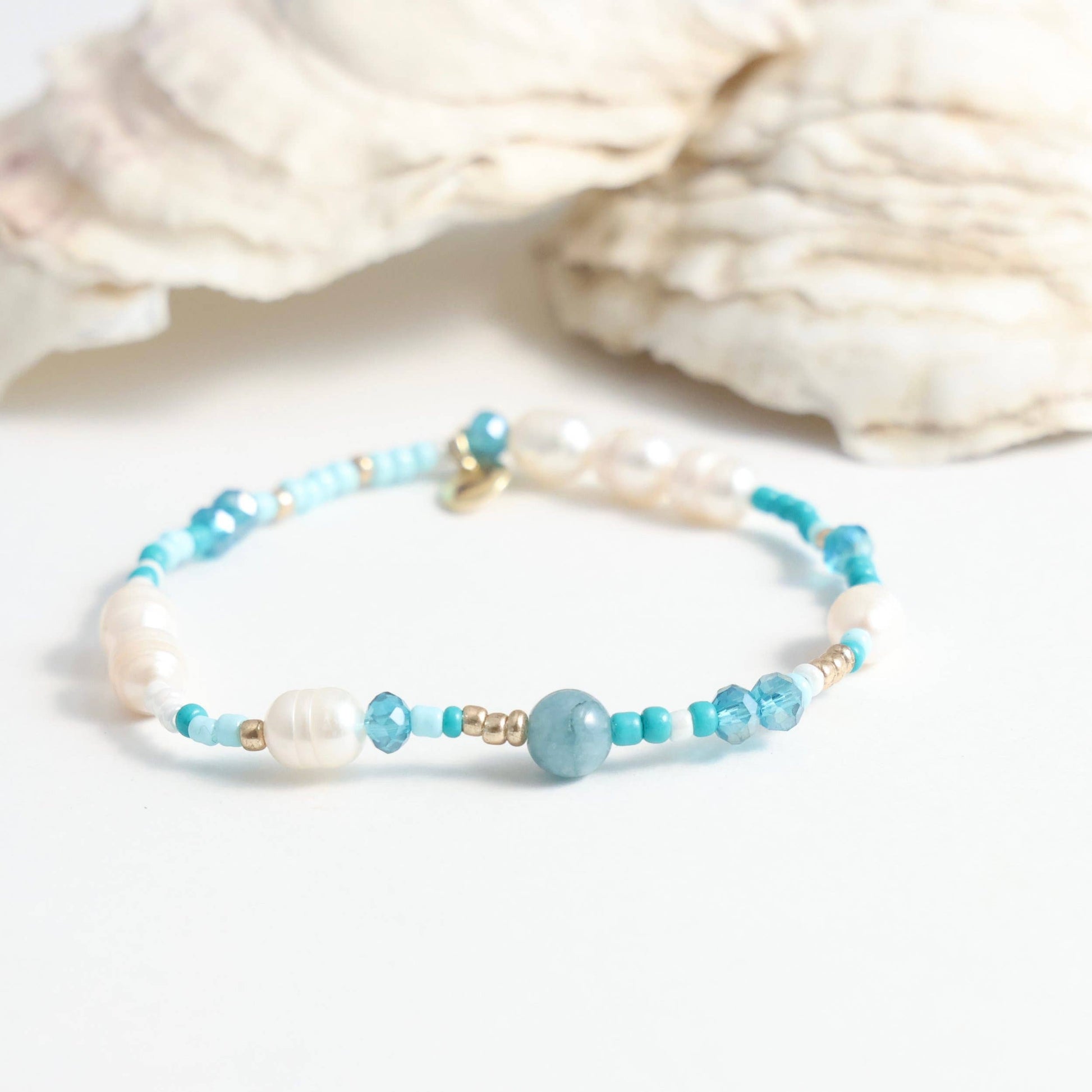Featuring freshwater pearls with blue, green, and turquoise seed beads.