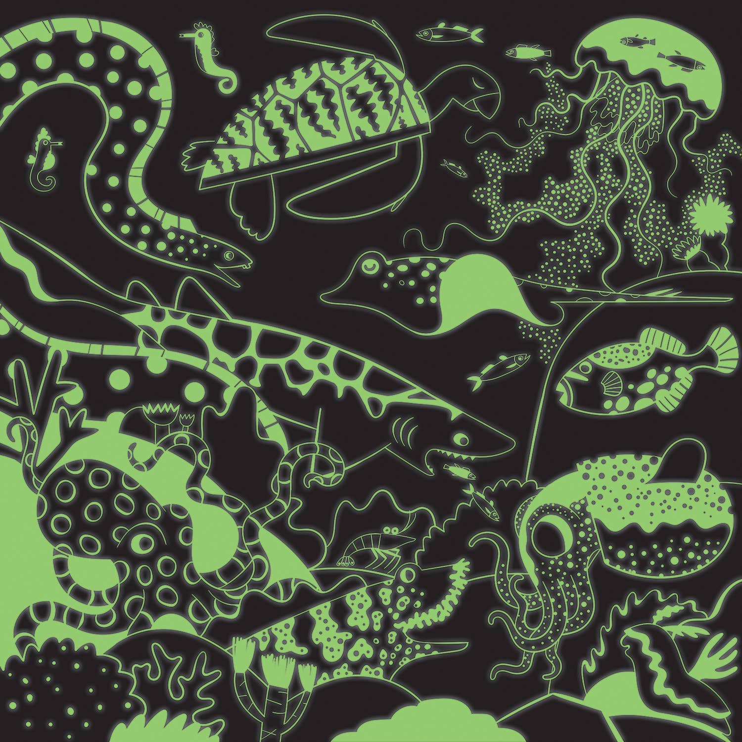 Piece together a colorful underwater scene with Mudpuppy's Ocean Illuminated 500 Piece Glow in the Dark Family Puzzle. After you complete the puzzle, turn out the lights to reveal glowing sea life surprises!