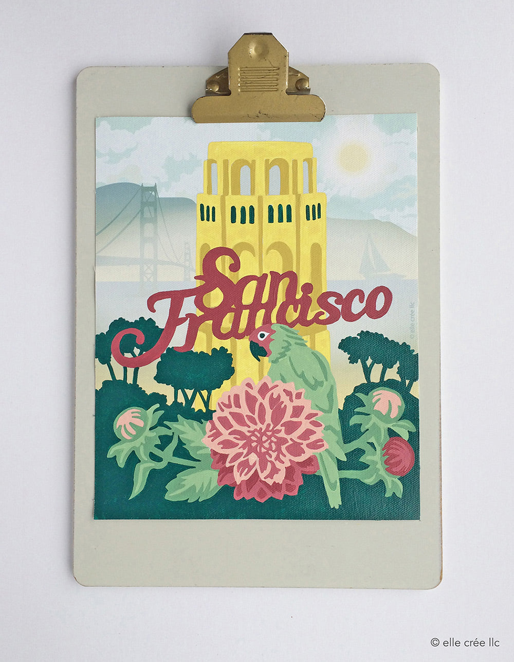 Parrot at Coit Tower paint-by-number depicts a wild parrot resting in a bouquet of dahlia flowers – San Francisco's official flower – with Coit Tower perched atop of Telegraph Hill. The pre-printed background features the San Francisco Bay and the Golden Gate Bridge in the fog. Completing the acrylic painting can take between 3-5 hours. When completed, select a frame at your local craft store and display your new handmade home decor! This DIY craft is recommended for adults and teens age 13 and up.