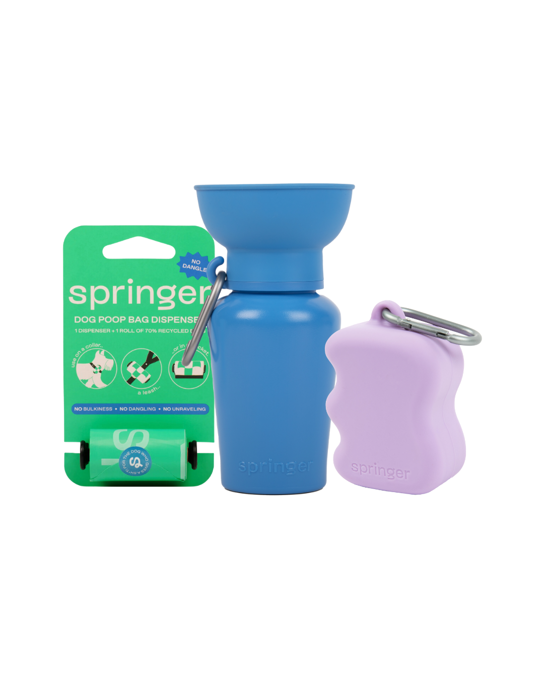 The perfect starter set for every dog owner, featuring everything you need for daily walks and adventures. The Dog Essentials Set includes a Springer Dog Travel Water Bottle of your choice in size and color to keep your dog hydrated on the go, a durable Silicone Dog Treat Dispenser for training and rewards, and premium dog poop bags made from recycled plastic for responsible cleanup. Transform your daily walks =with this all-in-one solution that covers hydration, training, and cleanliness essentials.