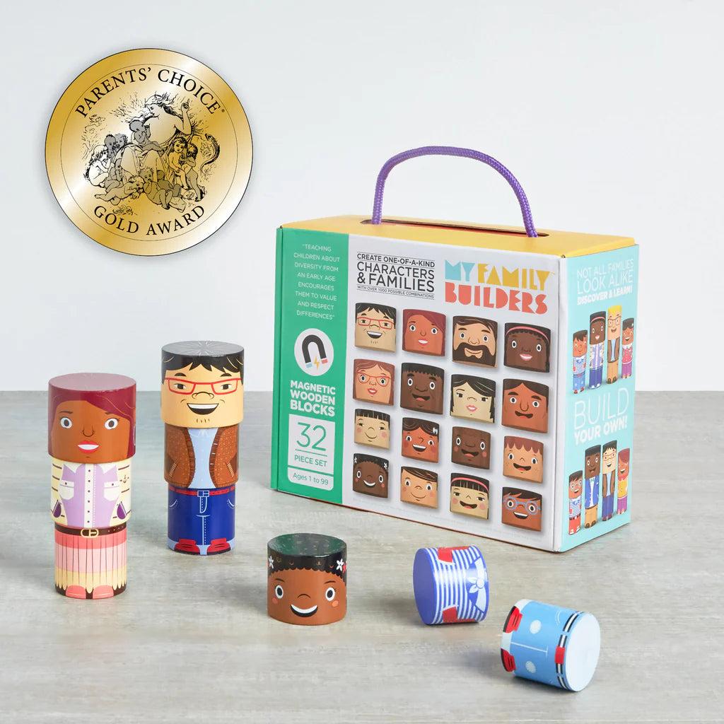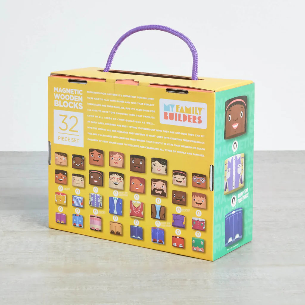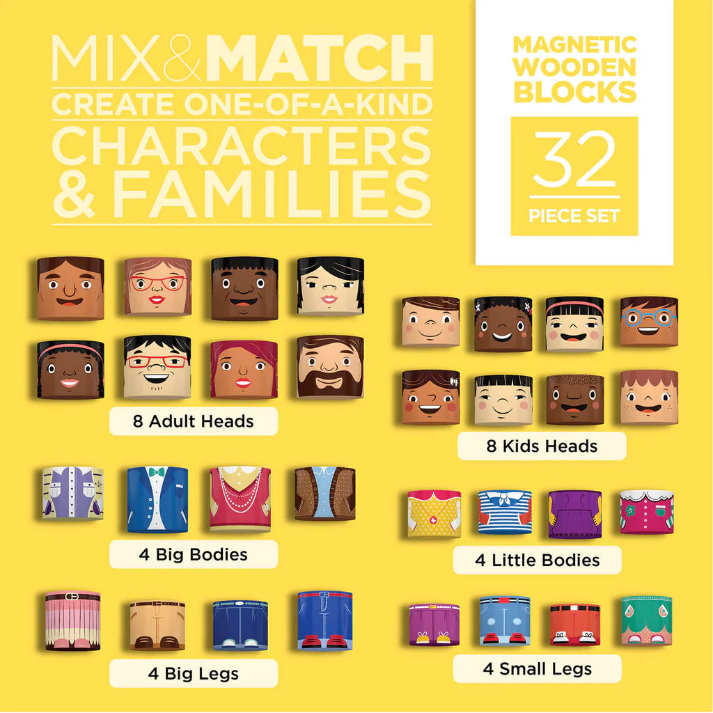 Explore family dynamics with My Family Builders Magnetic Building Blocks. This interactive set allows children to create diverse characters that reflect their community. With unlimited combinations and thousands of mix-and-match possibilities, our magnetic blocks offer endless character creations. They’re perfect conversation starters for discussing diversity, gender roles, acceptance, and empathy. Our 32-block set represents all genders and ethnicities. It includes 8 adult and 8 kid heads; 4 big and 4 small bodies; and 4 big and 4 small legs, reflecting the diversity of our society.