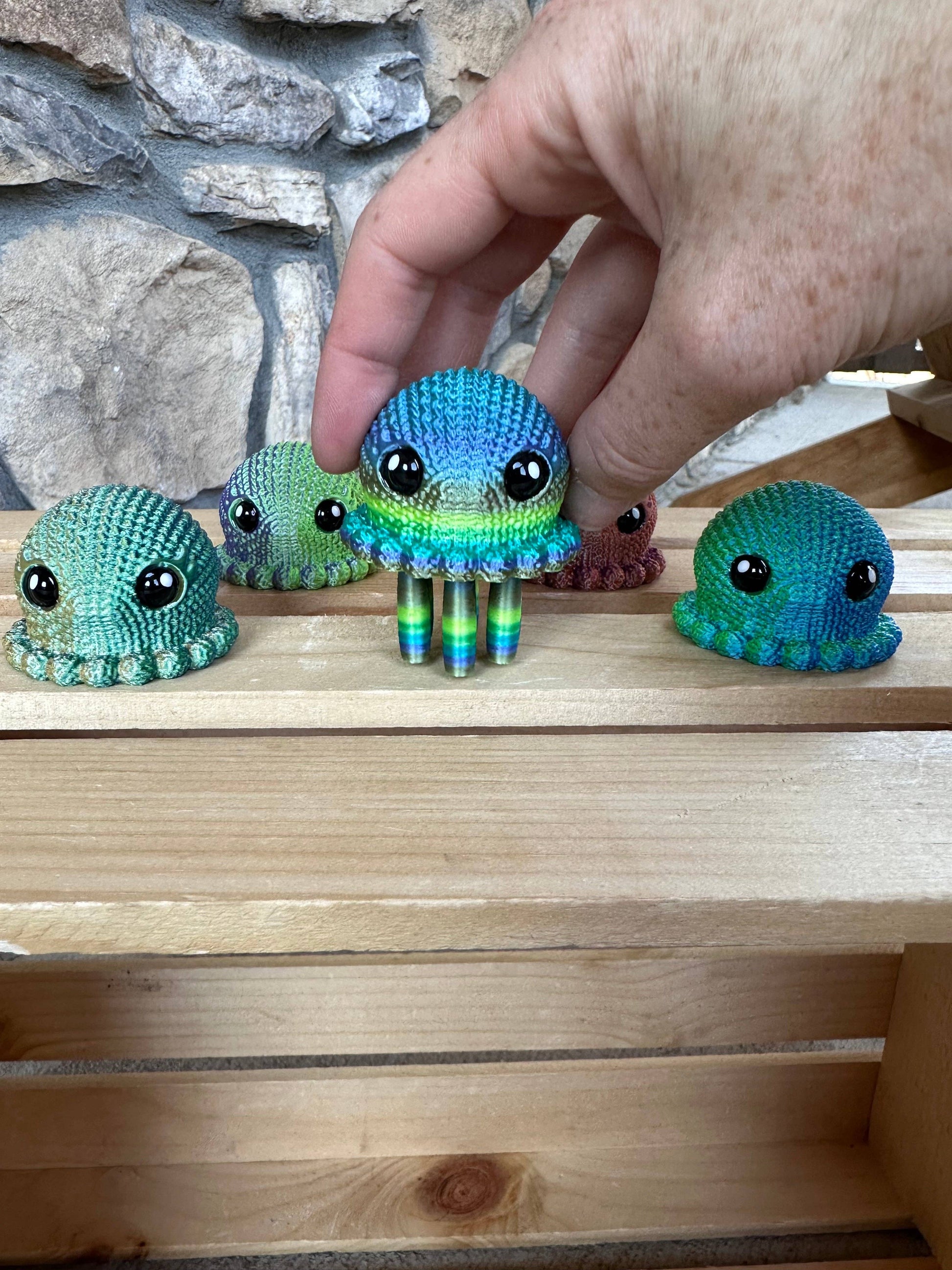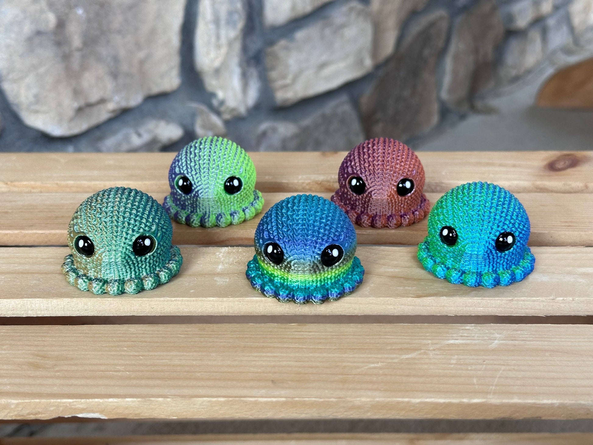 3D printed baby jellyfish fidget toy with hand painted eyes. Each pack contains a random selection of color shift, solid, gradient, and rainbow filaments.