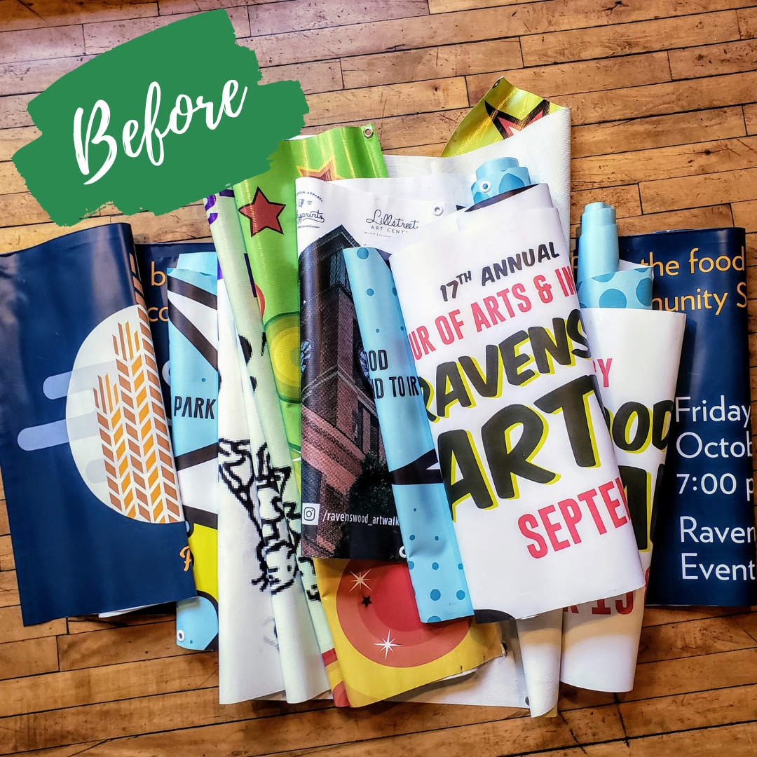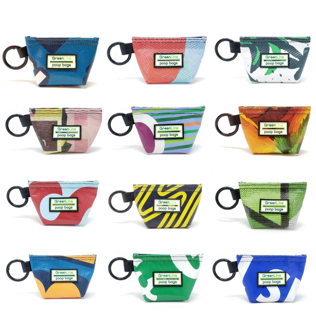 These bags have a story. They were banners, discarded after the festival and destined for a landfill. Transformed into a poop bag pouch with a purpose, each one is handmade and one-of-a-kind. Made of repurposed vinyl festival banners, the pouch attaches to the leash with a carabiner. Top velcro closure and bags dispense through a slot in the center of the patch. Size: 4" x 2-1/2". Includes 1 roll/12 bags of GreenLine Biodegradable Dog Poop Bags. Assorted colors. (Photos are for example only.)