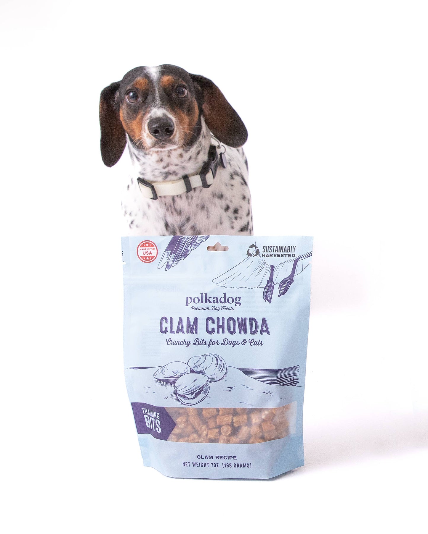 Perfectly sized for training, our NEW Clam Chowda Bits are light and crunchy, rich in omega fatty acids, easily digestible, only 4 ingredients!
