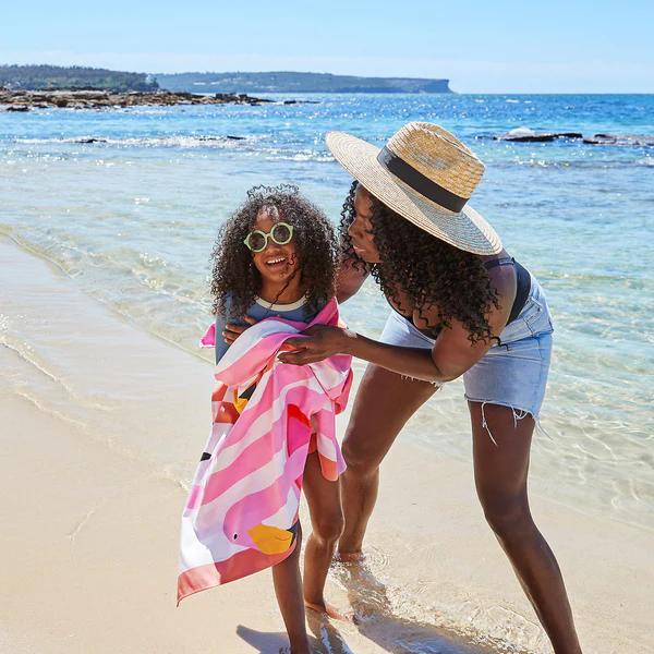 The signature striped, quick-dry towel that started it all shrunk to child-size. Kids can take it to the beach, use it in the bath, or wear it as a cape - let your little superhero run wild. It dries 3x faster than cotton and stays forever fresh - no more damp smells or sogginess. These towels are planet-kind, made from 100% recycled plastic bottles. They are lightweight & compact so ideal for travelers and explorers. They also repel sand with our unique loopless fabric, shaking sand straight off.