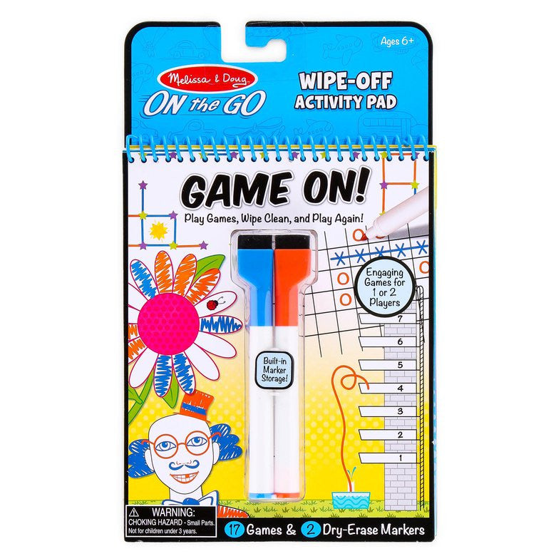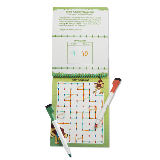 Take fun on the go with this "re-markable" take-anywhere book of dry-erase marker games! Choose from 17 different word, number and picture games for one or two players, including classics like hangman and I-spy, as well as games that are sure to become new favorite challenges. Two included dry-erase markers with built-in eraser caps store conveniently in the cover of the spiral-bound book, making it a perfect travel activity for kids six and older. It's easy to write on, erase, then play again!