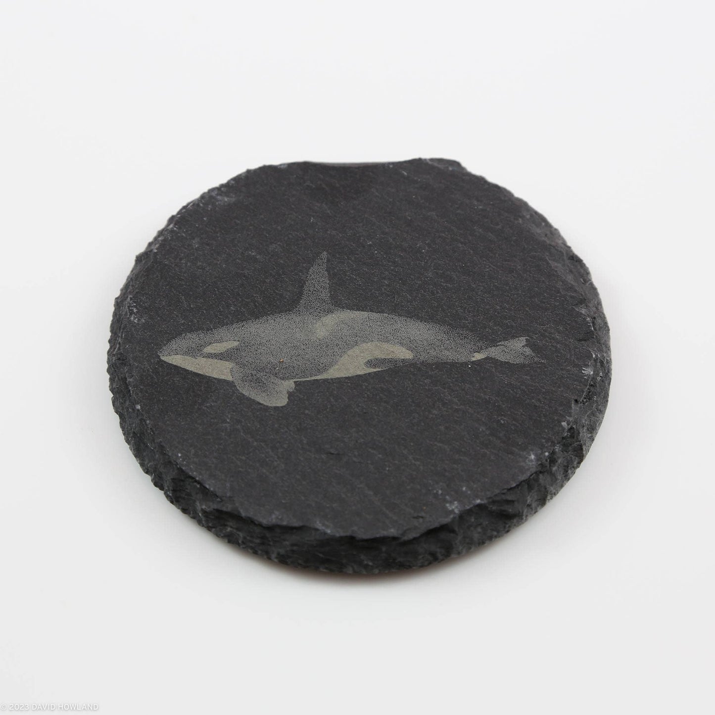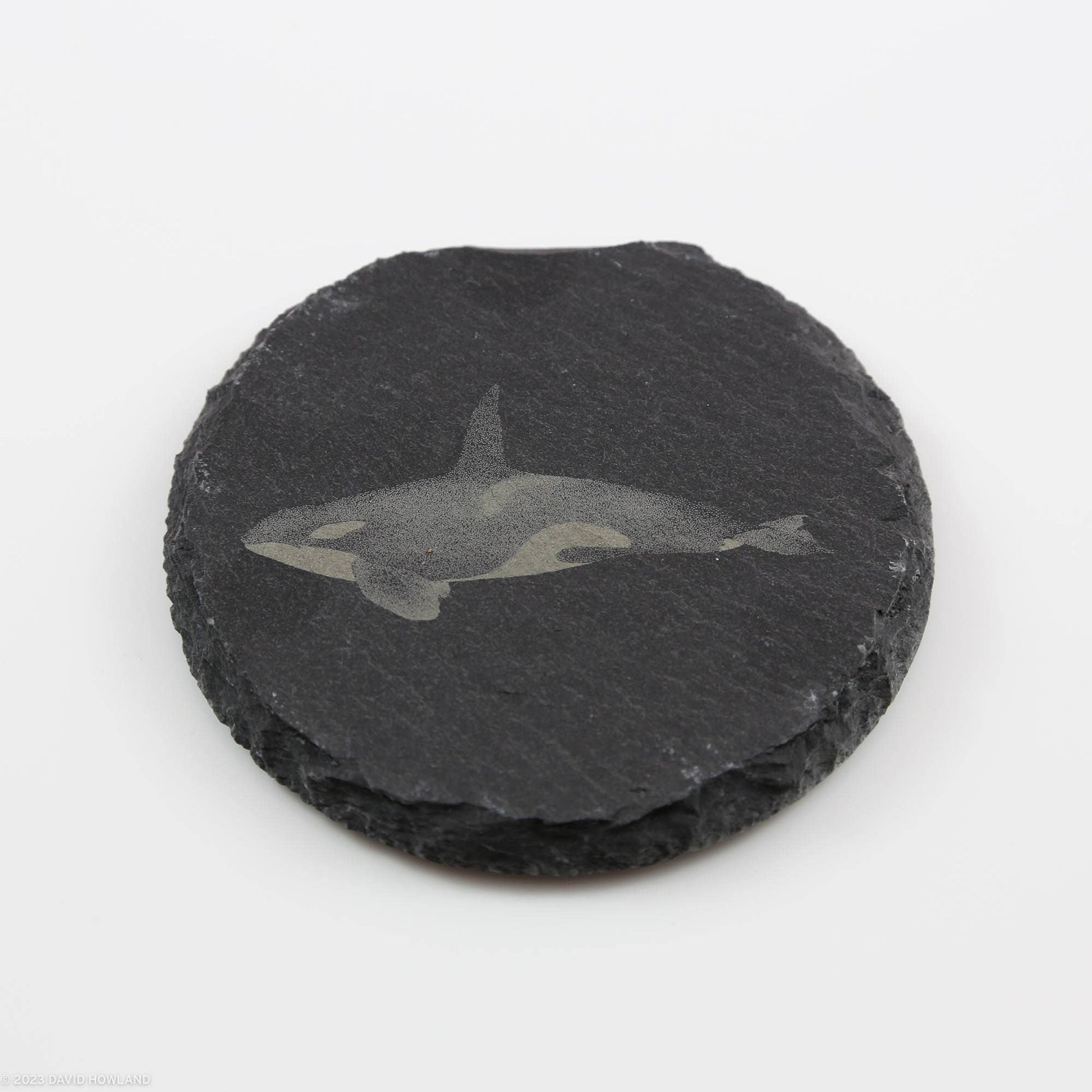 This slate coaster is laser-engraved with a drawing of an orca/killer whale.