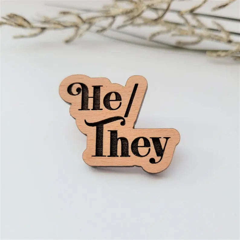 These beautiful handmade pronoun pins are laser engraved in-house on sustainably sourced hardwood. After your pin is engraved, it is finished with a silver pin back with a silicone grip.