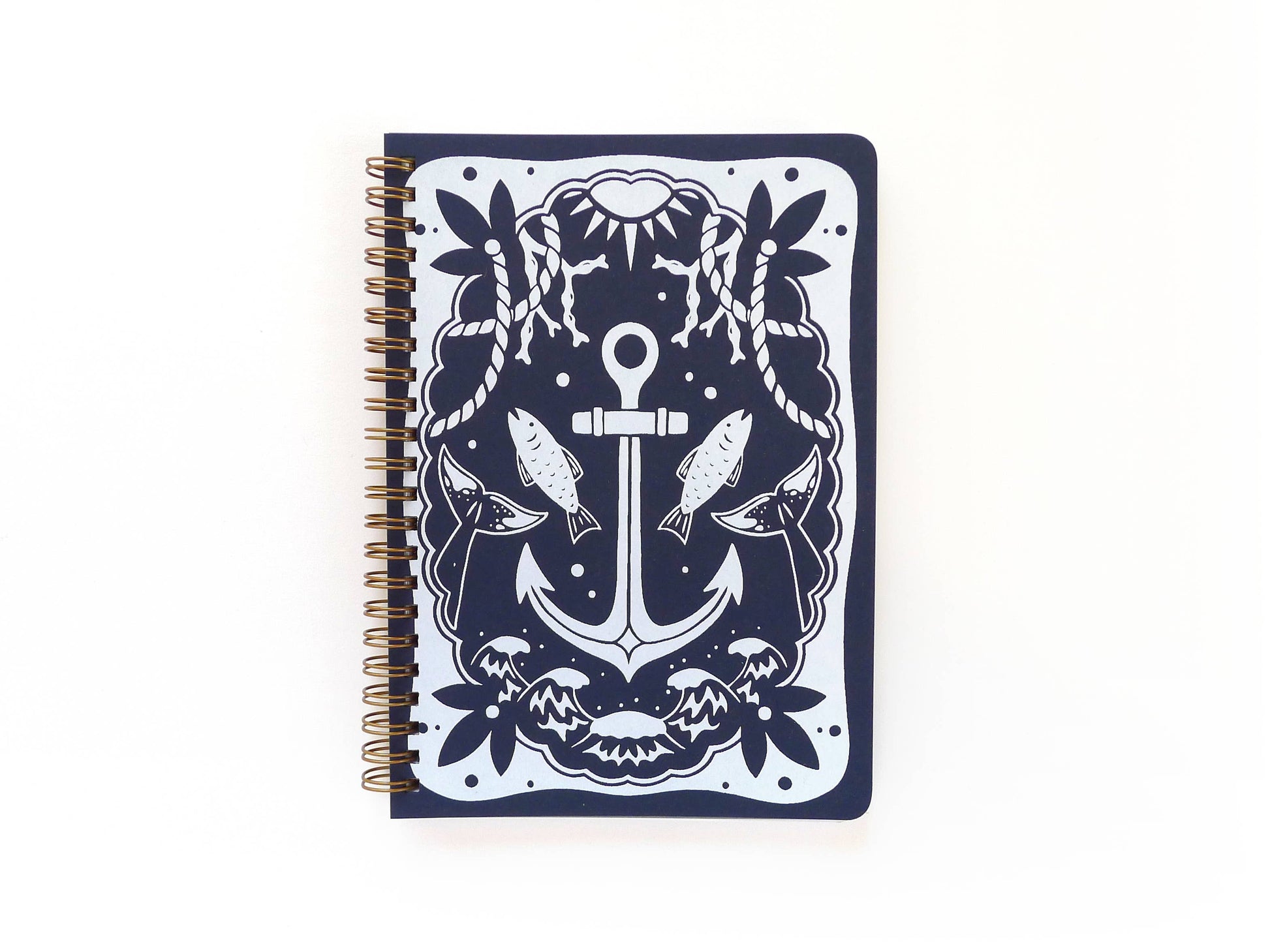 Our coil bound notebooks, printed and assembled by hand, are the perfect combination of rugged, practical, and good-looking. Our medium format journal is great for your desk or bag and its sturdy covers, rounded corners, and a brass coil binding protect your pages on the go. Covers are screen printed by hand and all notebooks feature contrasting endpapers.