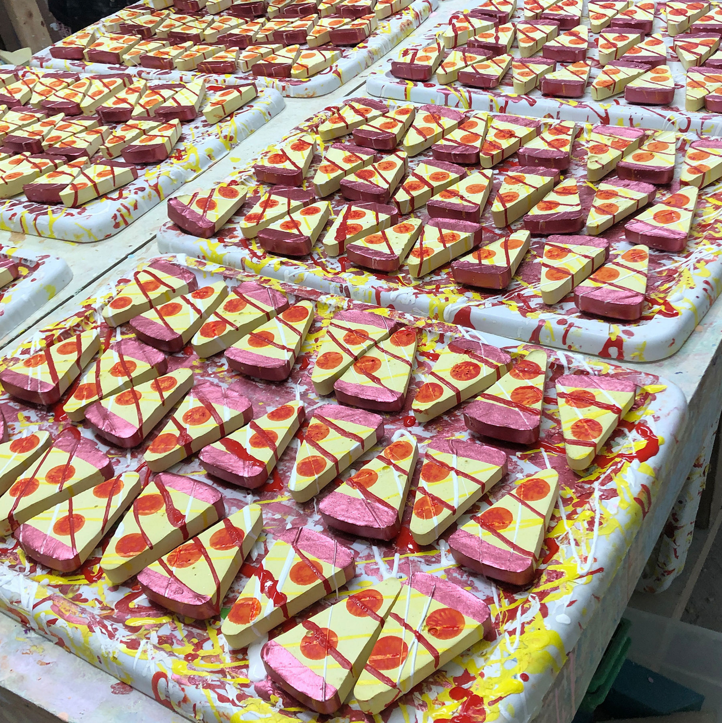 - 4 Pizza slices (1 yellow, 1 orange, 1 green, 1 blue, all decorated with toppings and red metallic crust)