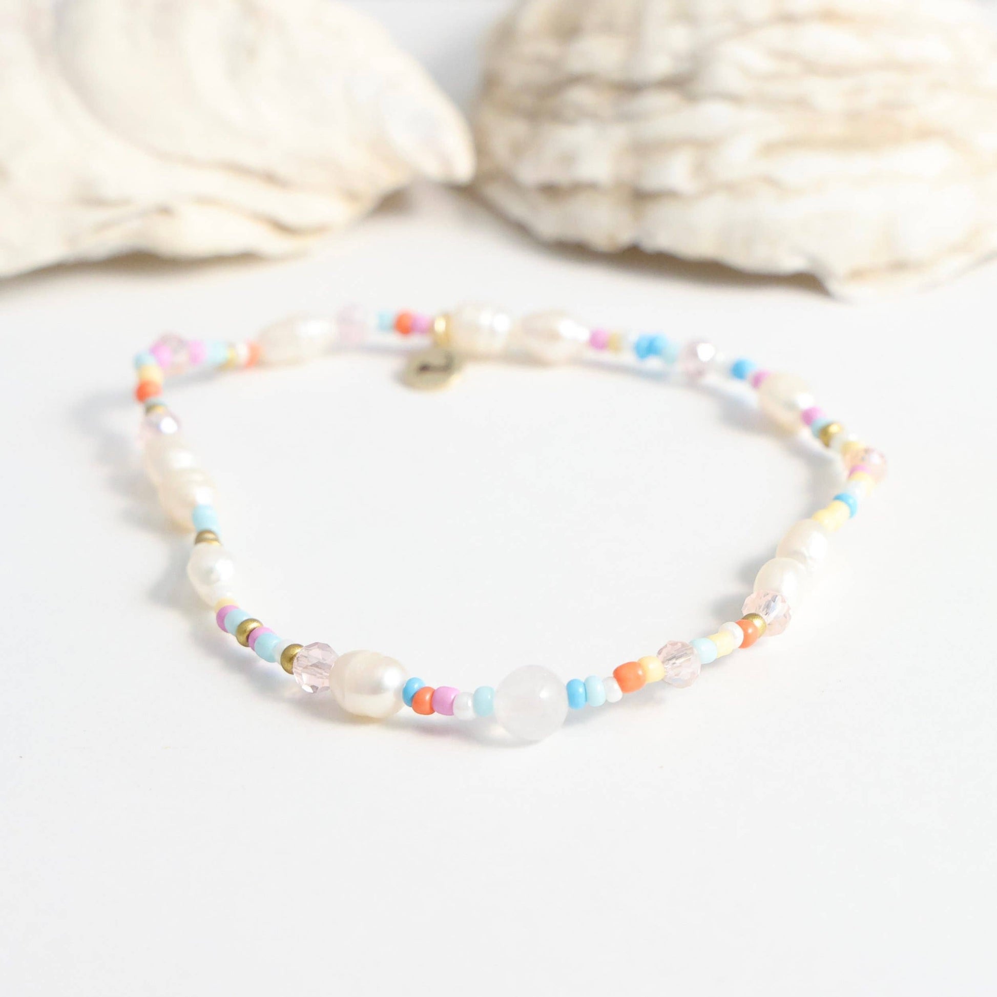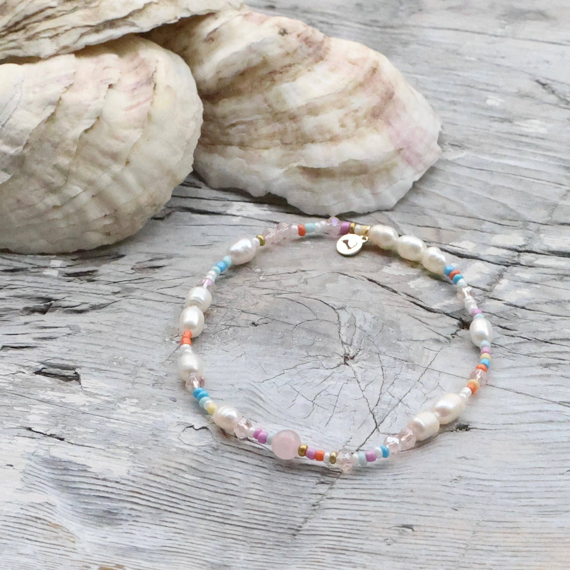 Made with freshwater pearls, mixed seed beads, and authentic rose quartz stone. Finished with our gold signature Cape Cod Chokers charm.